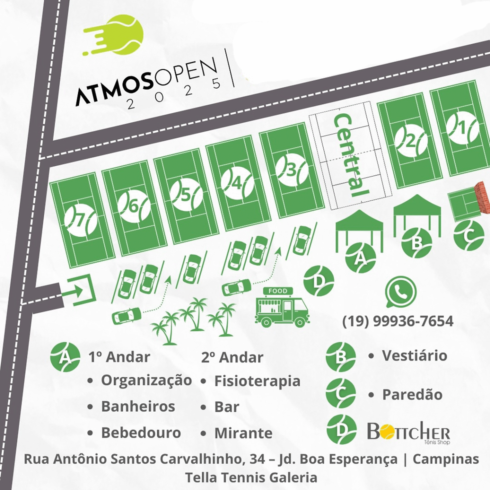 Está chegando a última etapa da temporada LTP TELLA TOUR 2025, o Atmos Open Spring. Esta etapa teve aproximadamente 115 inscrições. Um grande sucesso! A etapa ocorrerá nas quadras da academia Tella Tennis, unidade Vila 31 de Março, próxima ao Galleria Shopping, em Campinas, https://maps.app.goo.gl/Wnq9k9ZDUZfXFLky7 , a partir deste dia 17, sexta-feira.