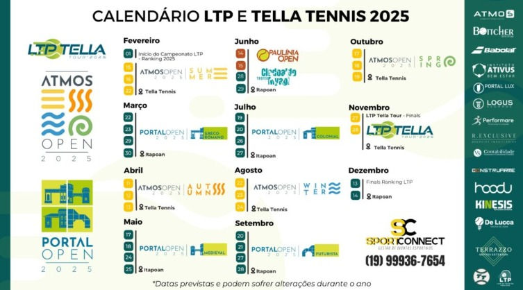 ATMOS OPEN WINTER na Academia Tella Tennis em Campinas/SP, nos dias 22, 23 e 24 de agosto. Este torneio está com as 120 vagas esgotadas e mais de 40 pessoas na fila de espera.